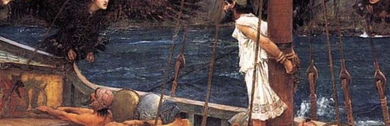 Odysseus stelt zich bloot aan het verleidelijke gezang van de Sirenen (schilderij van J.W.Waterhouse).